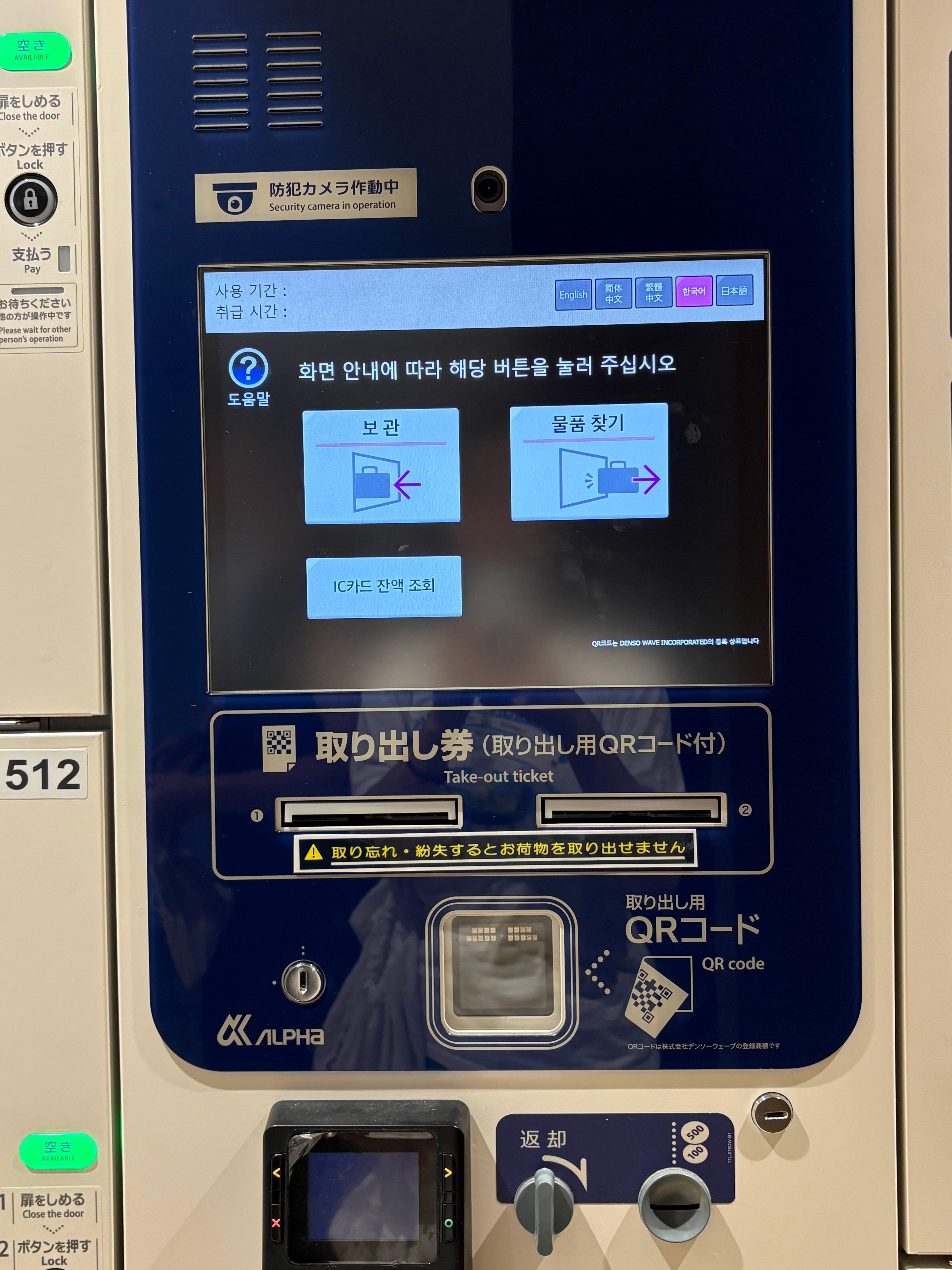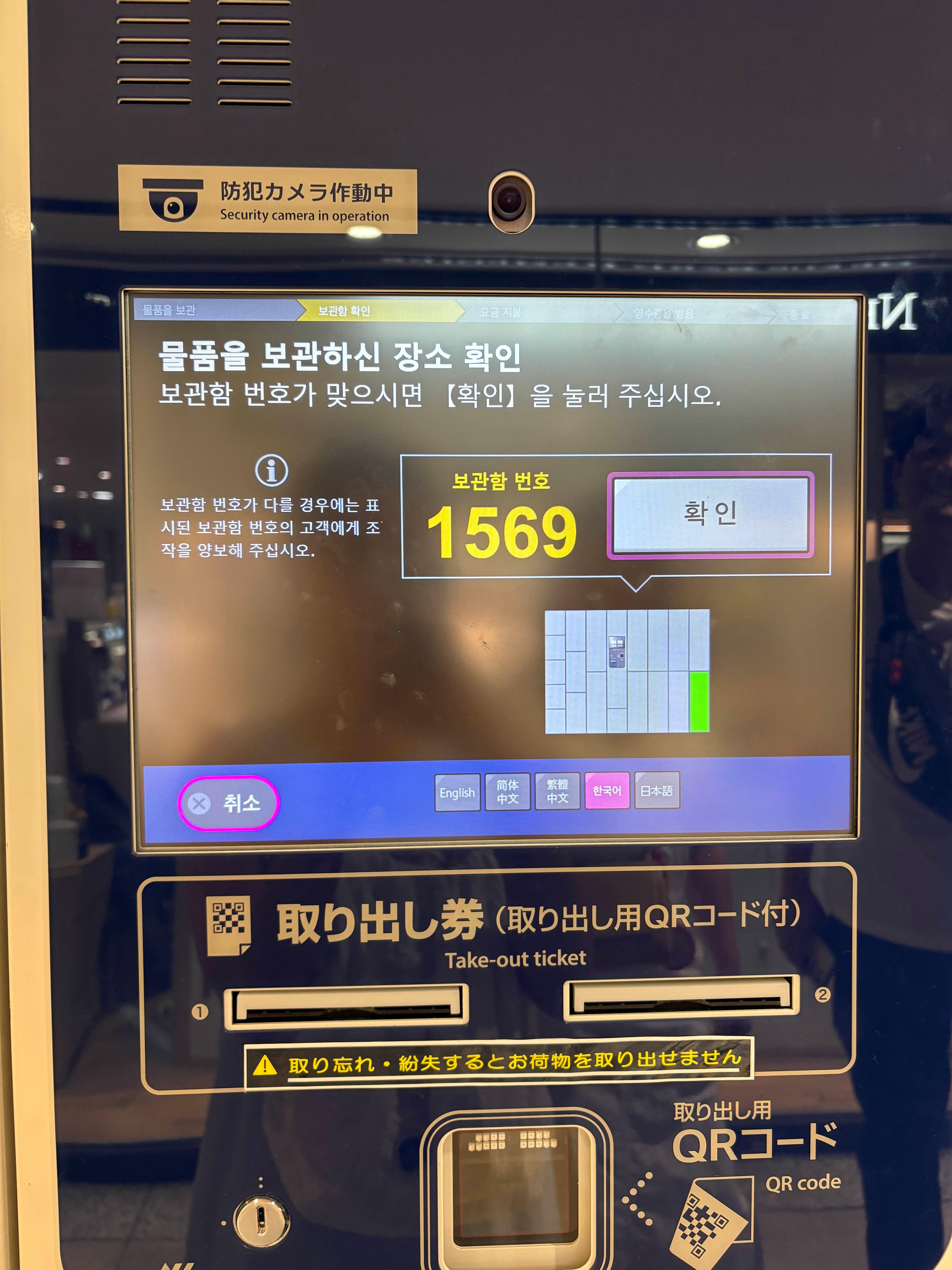 물품보관함은 한국어 지원이 가능해서 쉽게 물건을 맡길 수 있어요. 저희는 캐리어 1개와 백팩 2개를 맡길 예정이어서 2층 코인라커말고 비어있는 1층 코인라커 찾아서 보관했습니다.